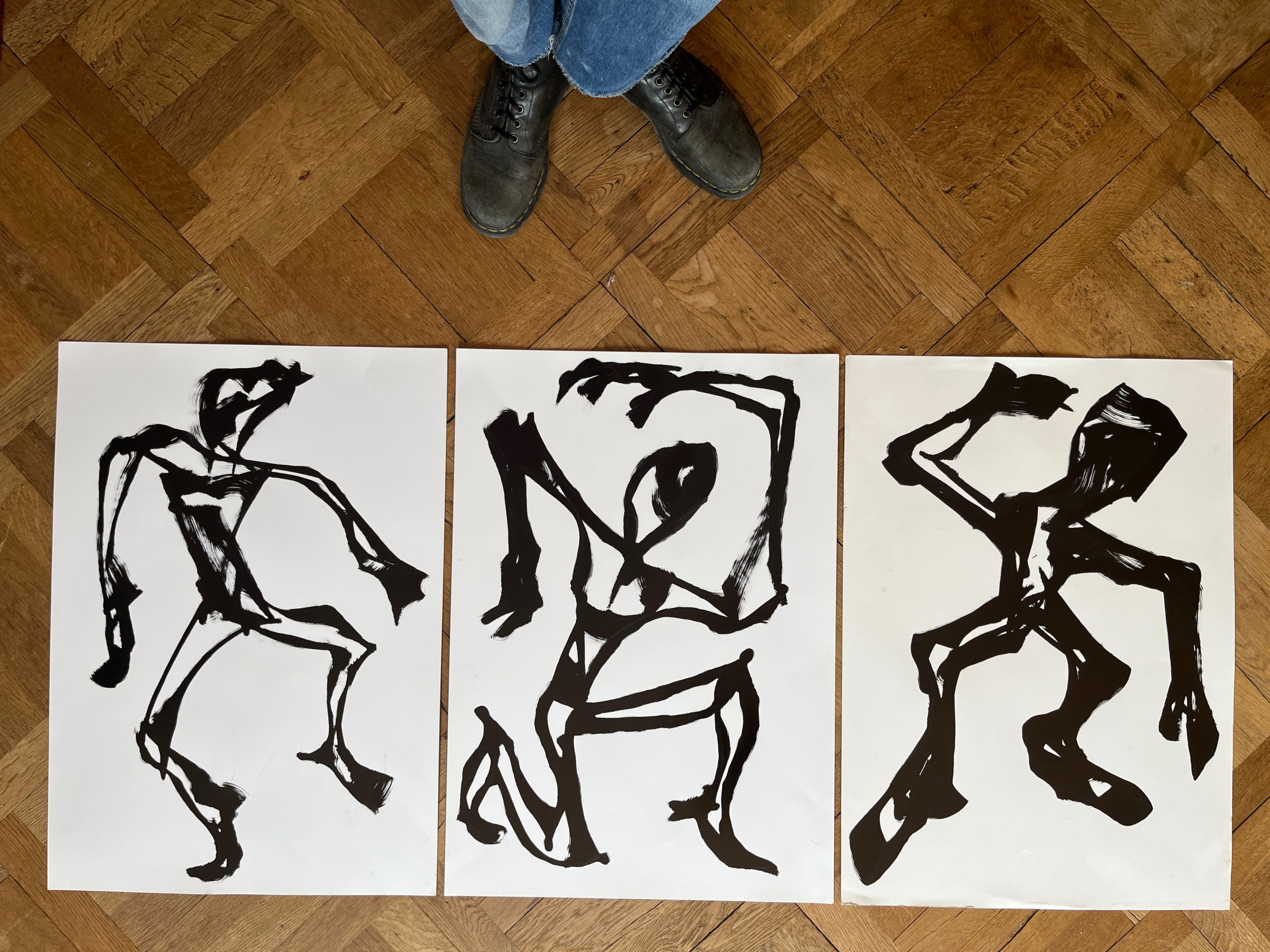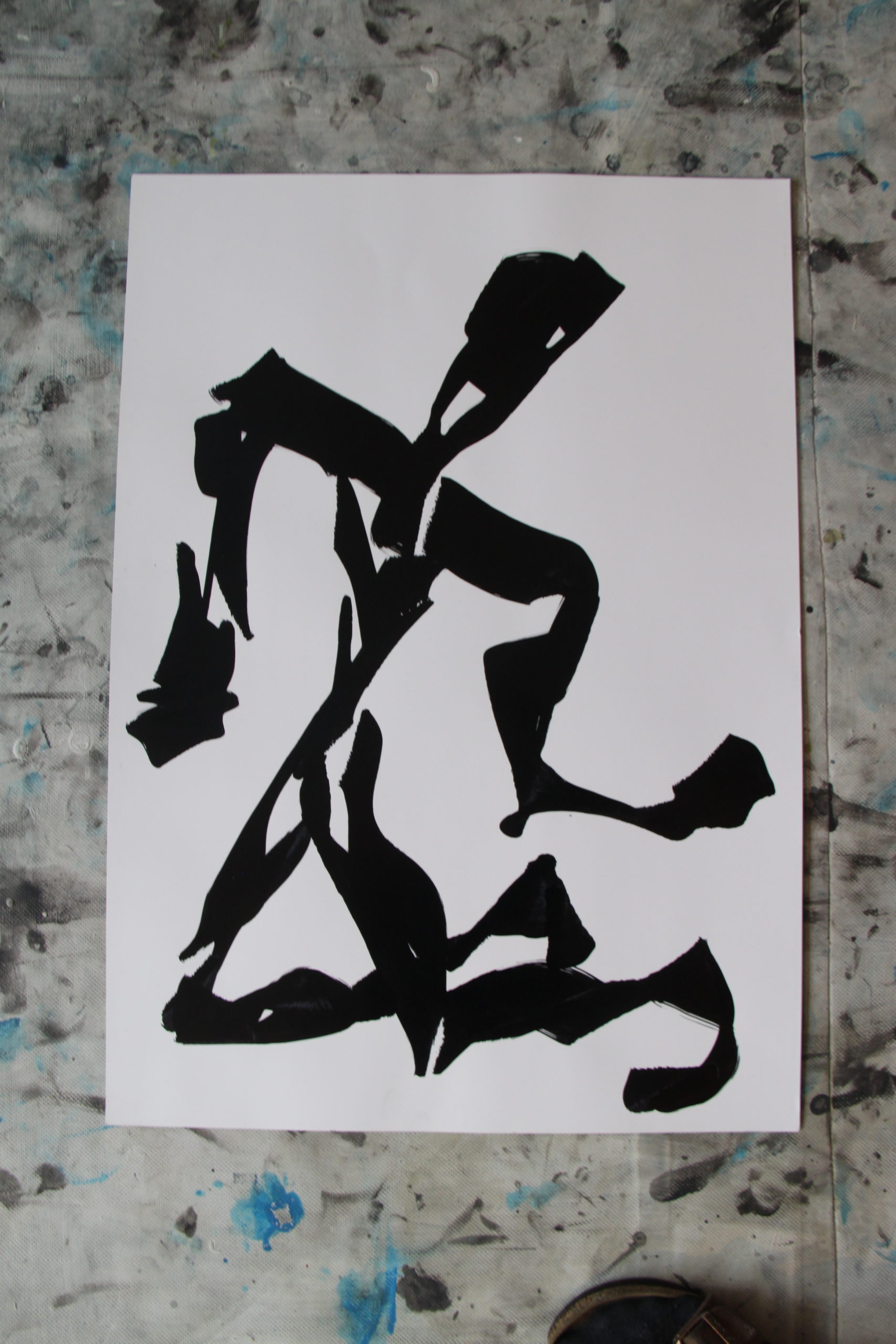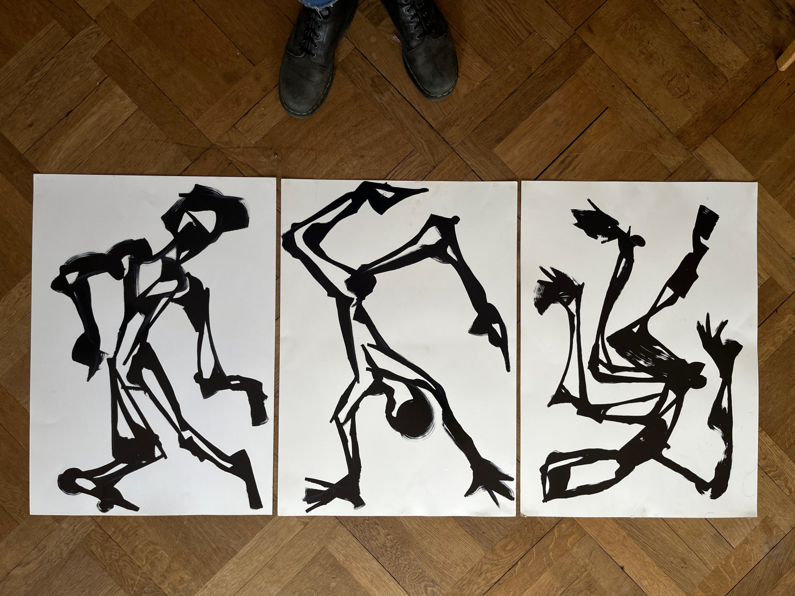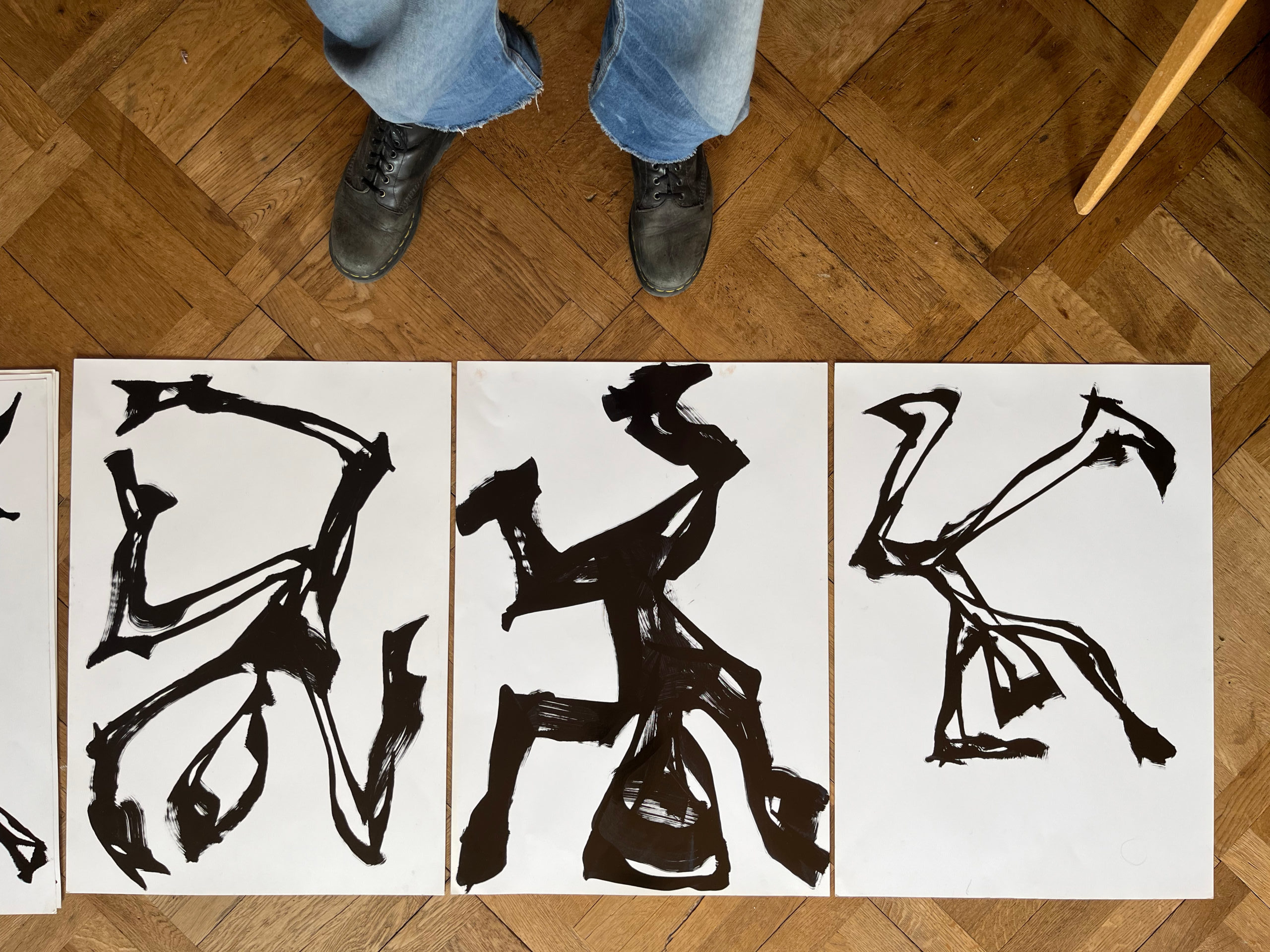 This same momentum is then extended to other media, such as paper or wood. The gesture retains its fluidity and intensity, capturing the energy of a moment rather than the form of a frozen movement. Whether observed or not, the dancing body remains an autonomous act, free from any external constraints, where the trace left behind becomes the memory of the movement.