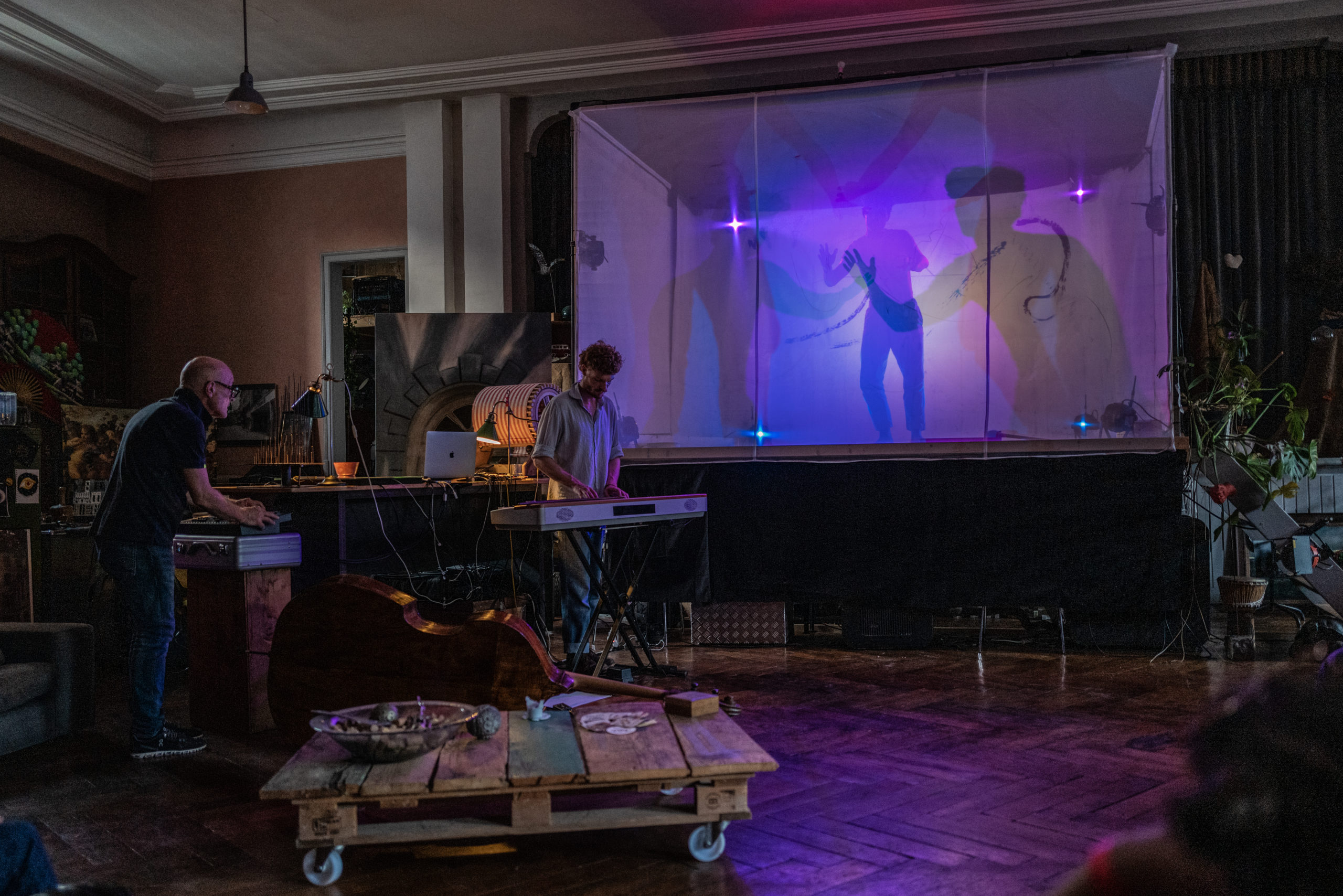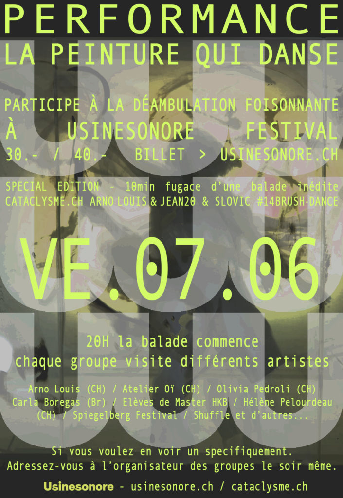 At the UsineSonore Festival, painting comes alive through a vibrant, immersive wandering performance. This innovative concept unfolded across five ten-minute sets, performed in alternation with Clovis Magnard, with whom I have collaborated three times in a duo format. The foundational music is provided by Jean20, while the performance is further enriched by the musical collaboration of Théo Louis on double bass and keyboard, adding a unique sonic dimension to our collective creation.